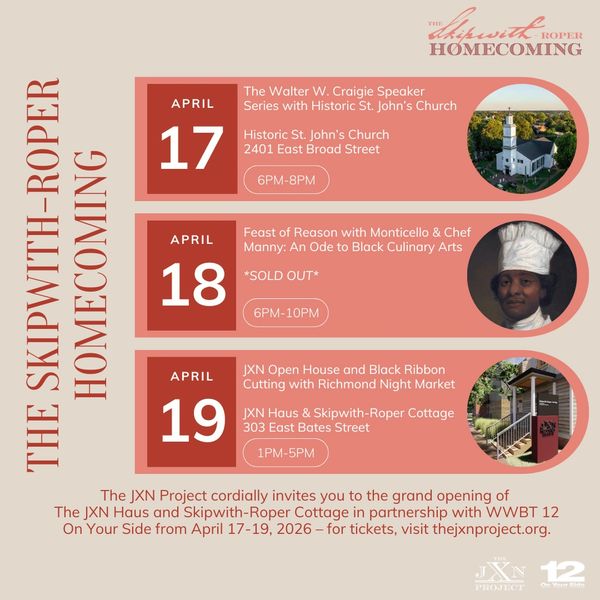 The JXN Project in partnership with WWBT 12 On Your Side cordially invites you to “The Skipwith-Roper Homecoming” to celebrate the grand opening of The JXN Haus and Skipwith-Roper Cottage from April 17 to 19, 2026.